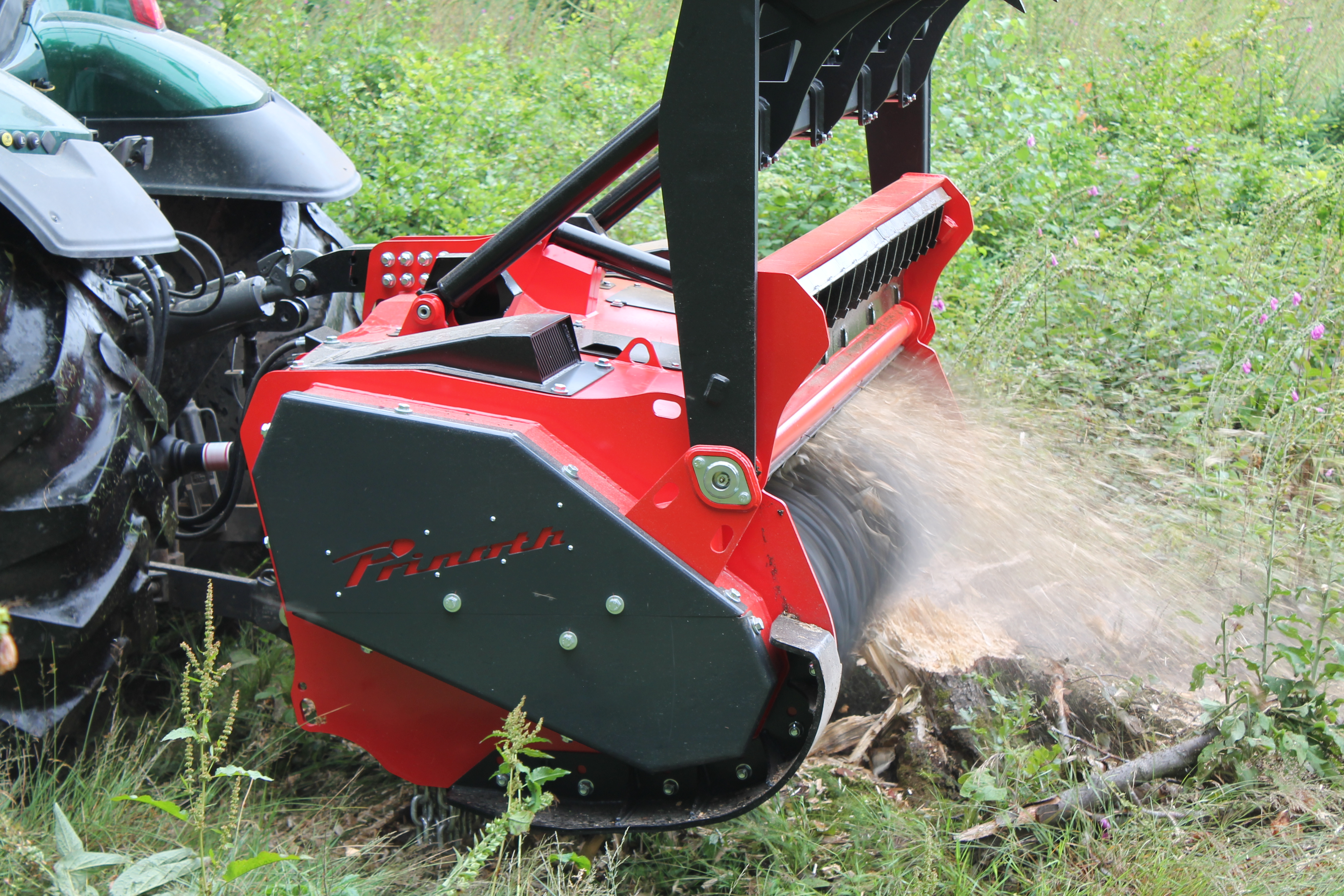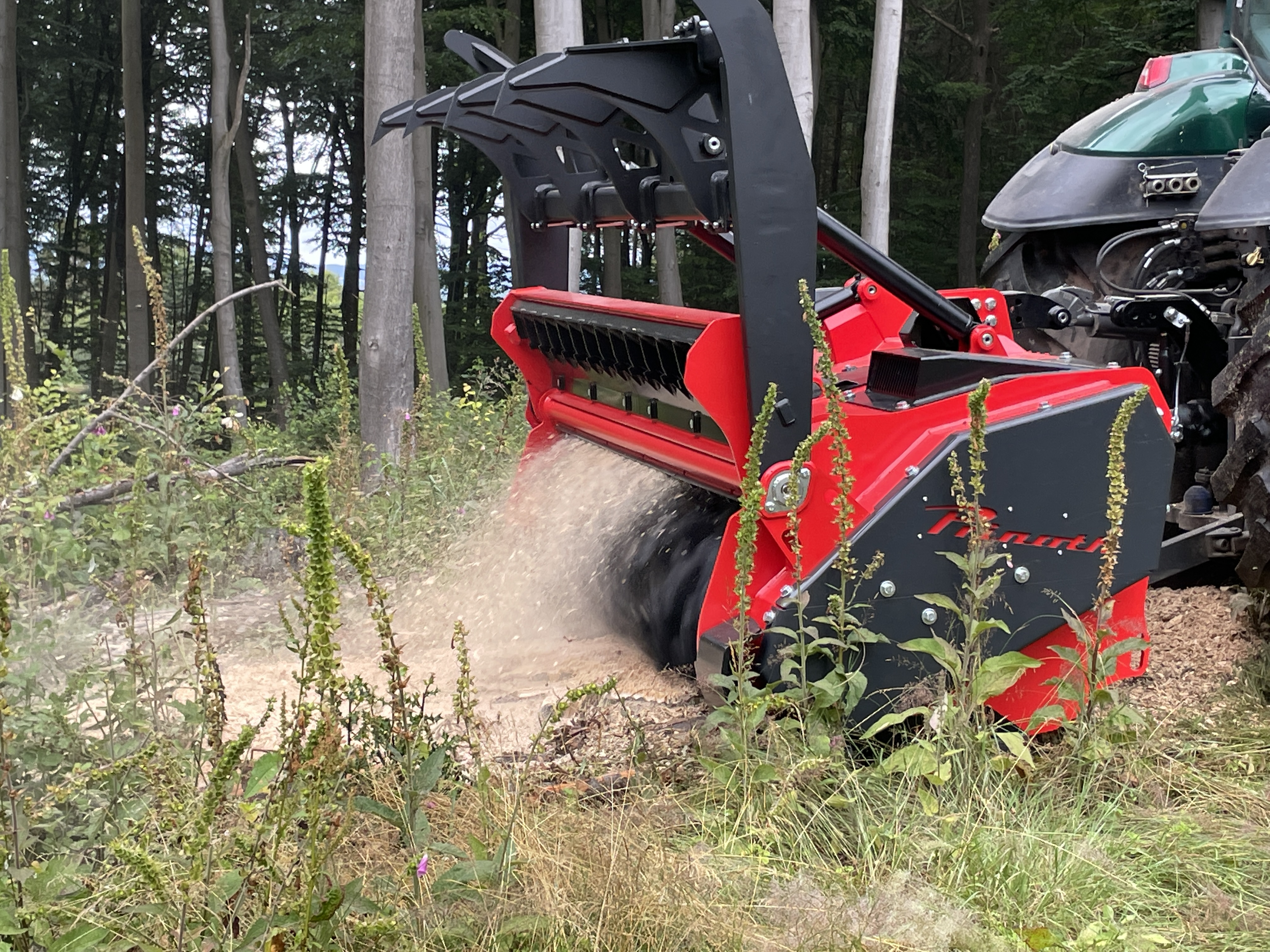 Die hydraulische Drückevorrichtung mit vier Zinken oder Bolzen führt und schiebt das zu mulchende Material.