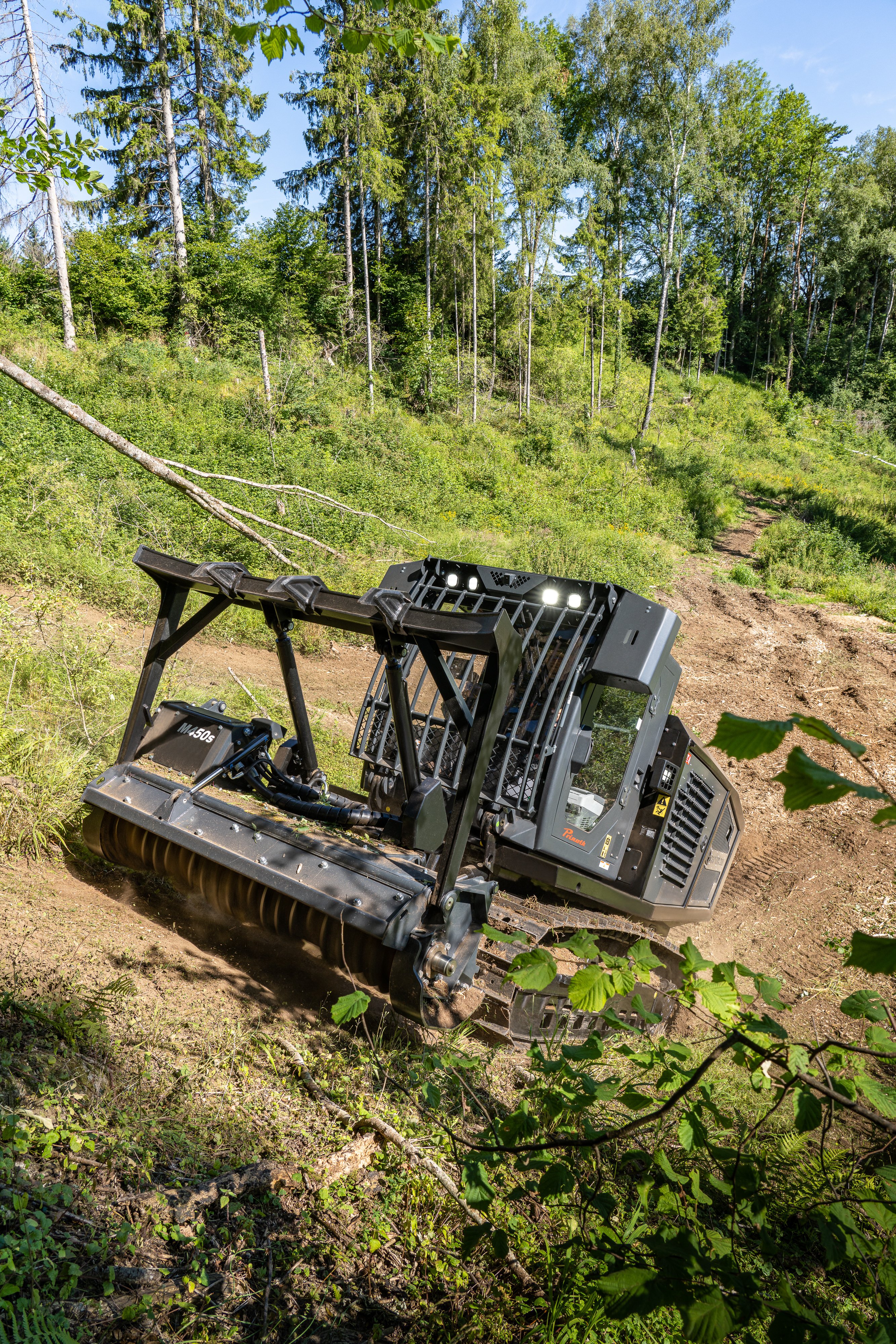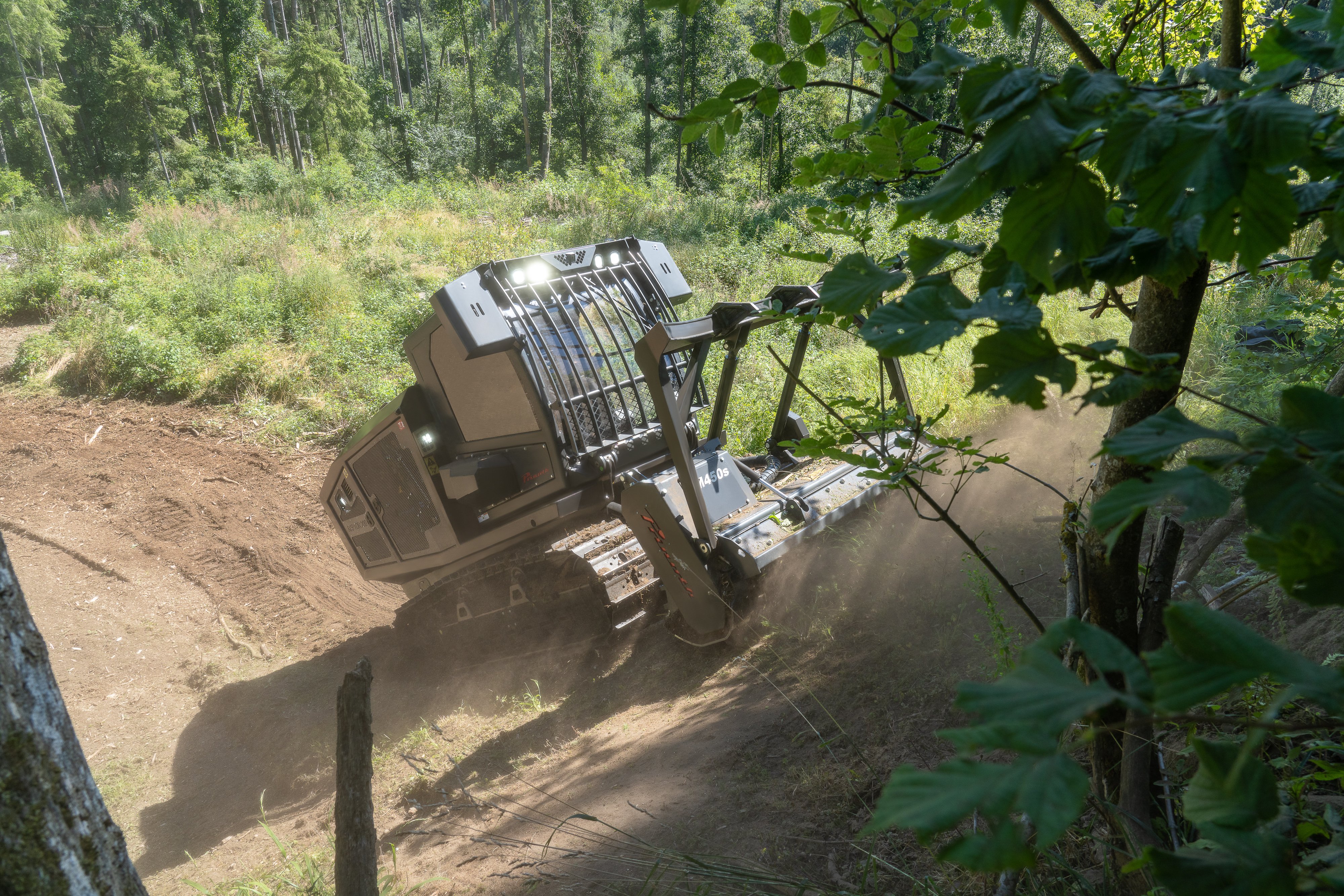With its powerful Cat C4.4 engine, the Raptor 200 is equally at home on steep slopes and on soft ground. With powerful 190 hp and an extremely low tare weight of 9.2 t / 20,280 lbs, the Raptor 200 impresses with its optimum power-to-weight ratio. The Raptor 200 is equipped with the M450s mulching attachment. It comes with a hydraulic push bar and flap, counter blades and the patented BCS/UPTs rotor system for optimal results.