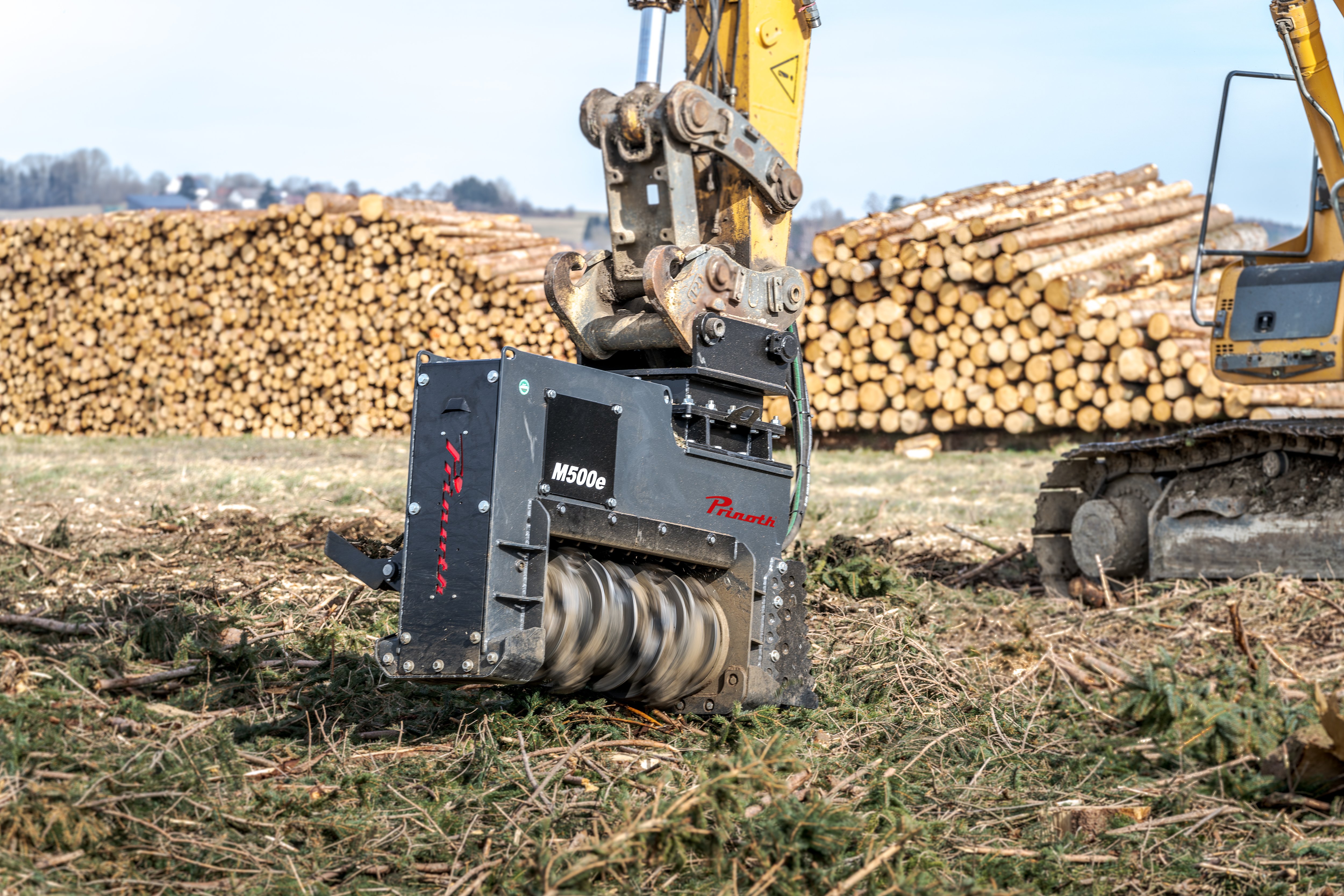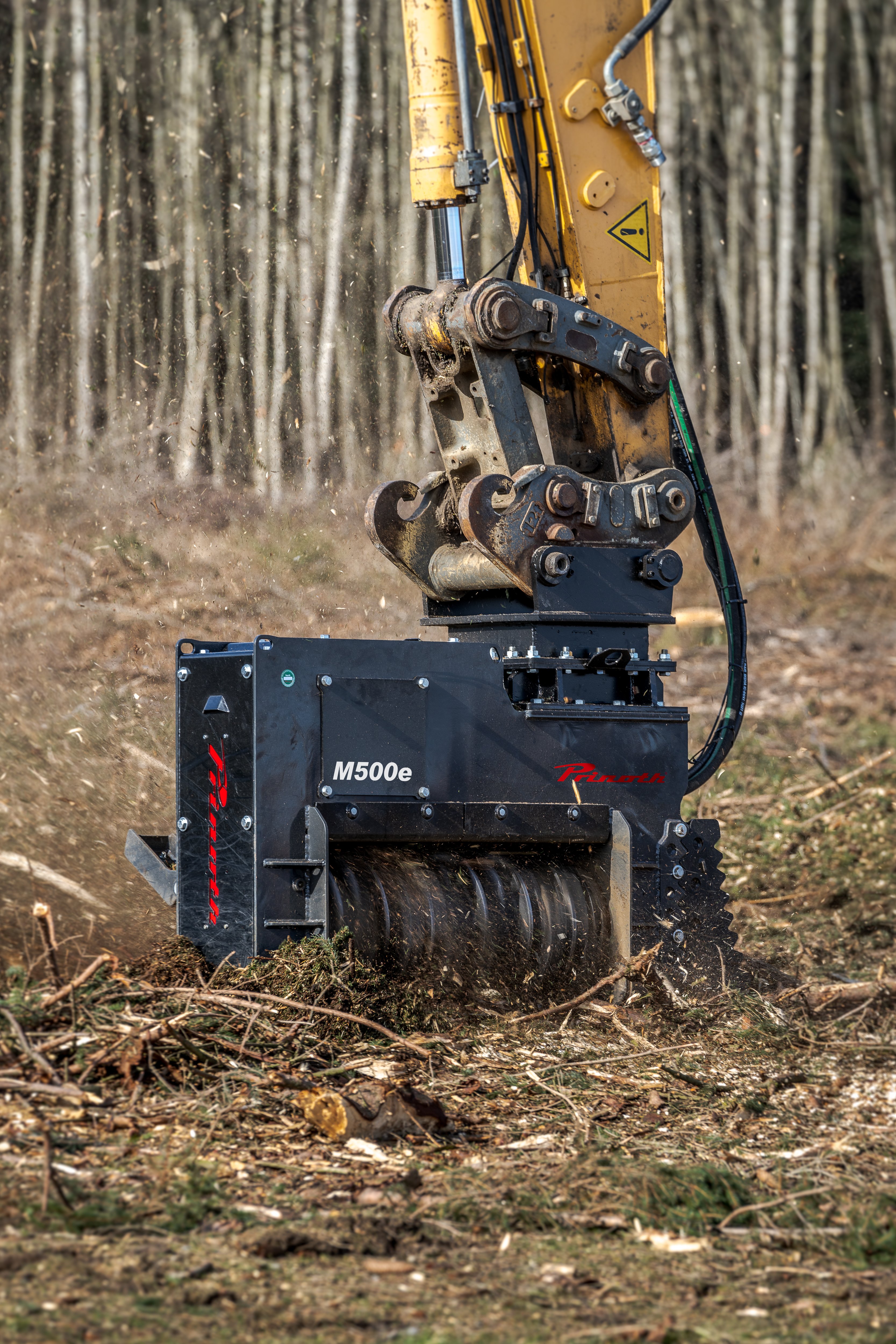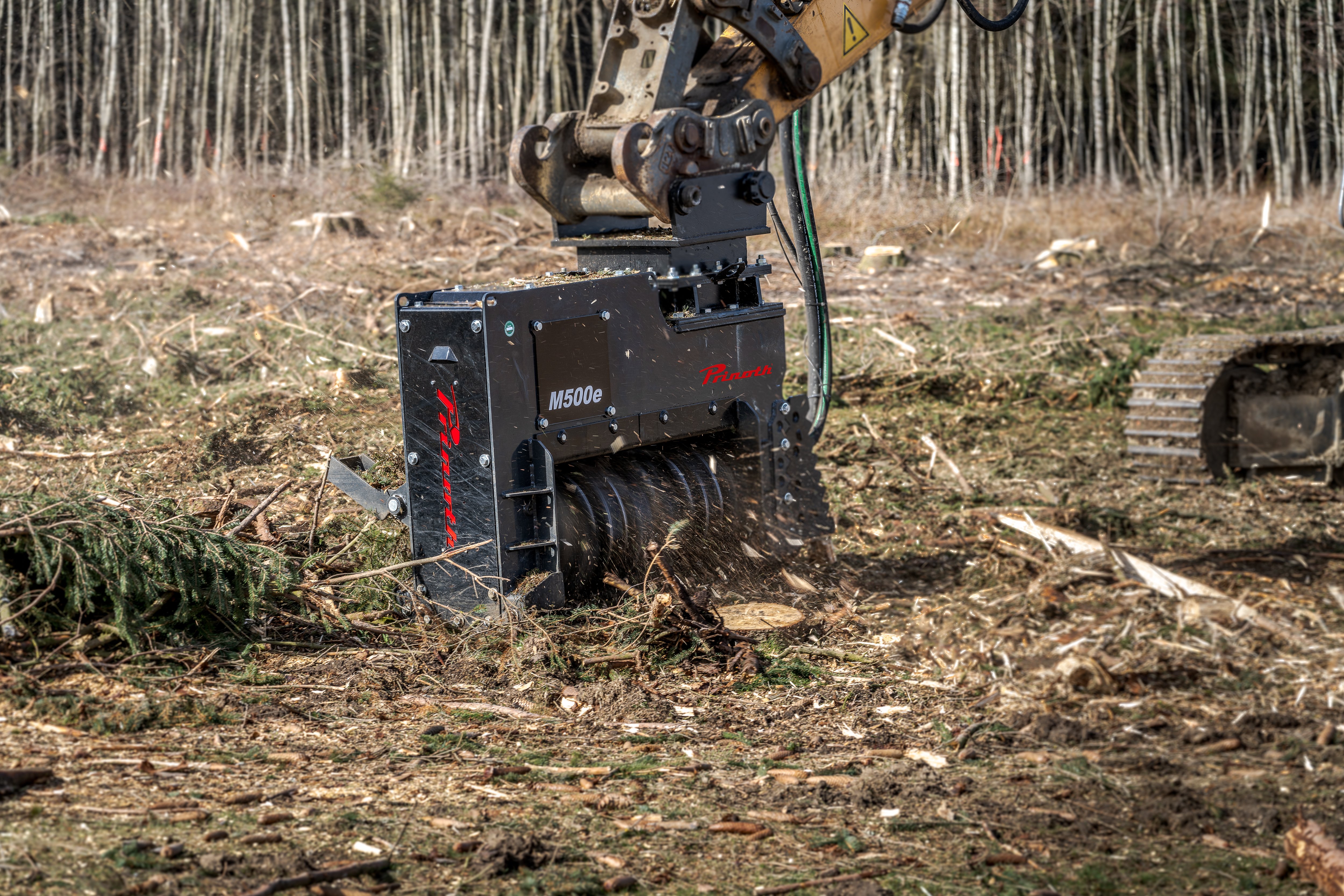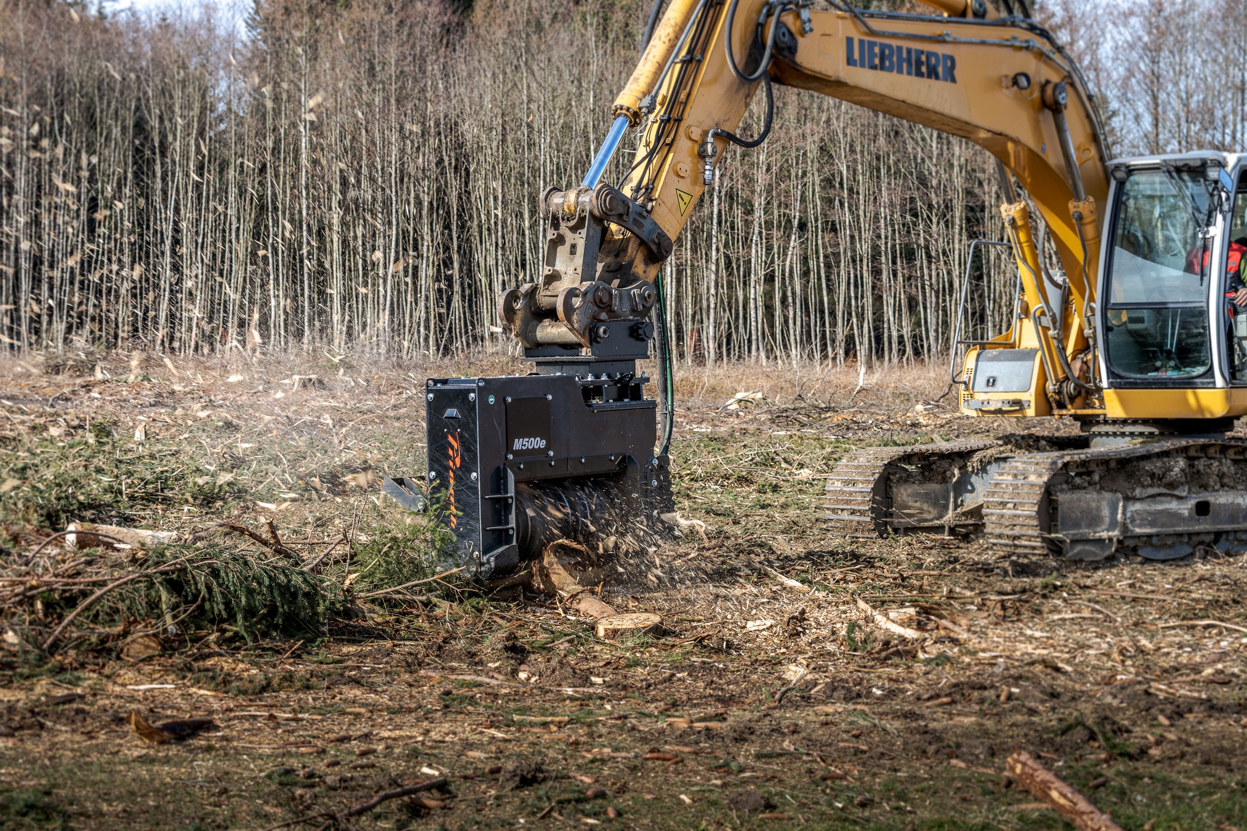 Grizzly M500e is a forestry mulcher for the class of 18 - 25 t excavators. Its robust and compact housing design makes it universal for mulching trees and heavy brush.